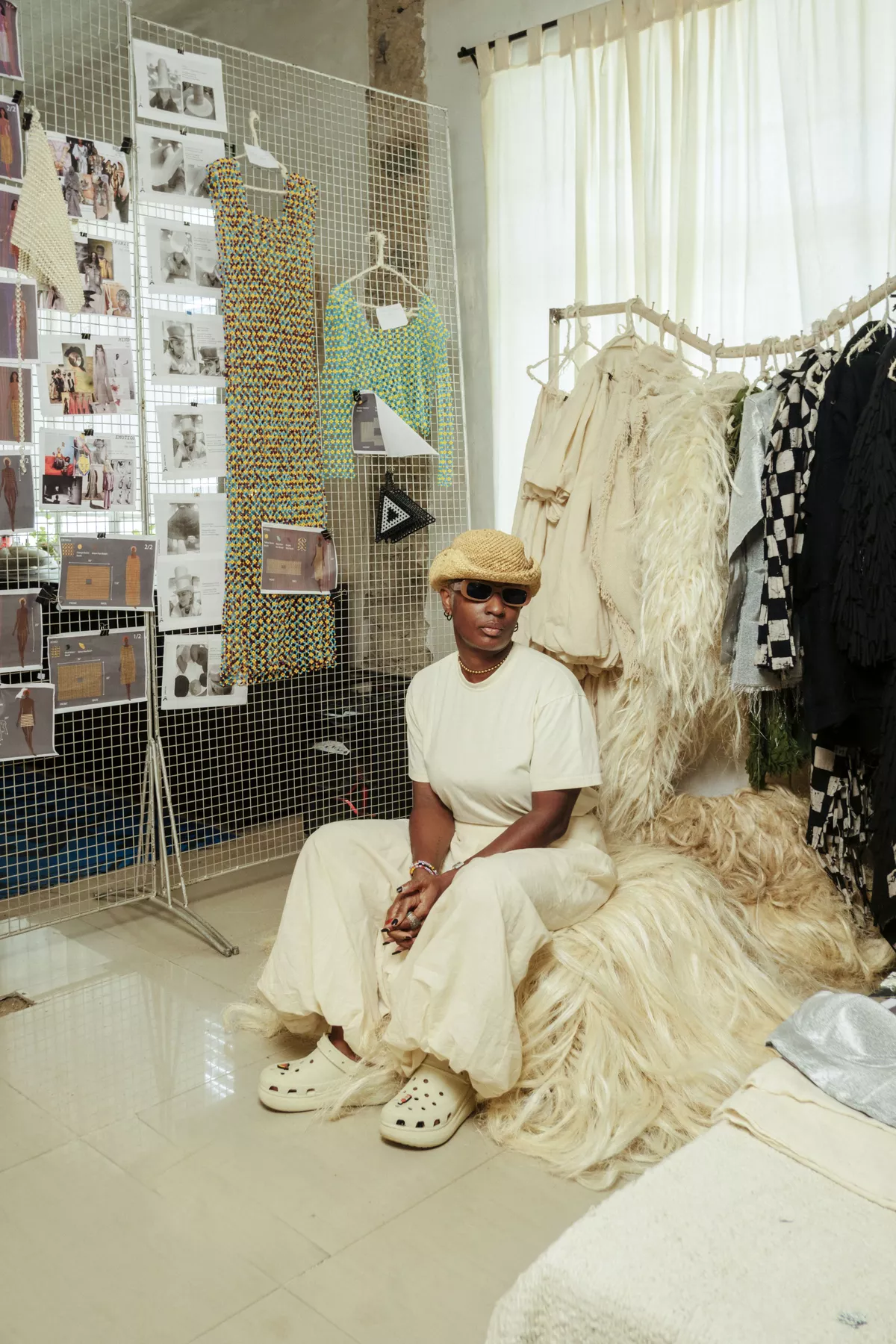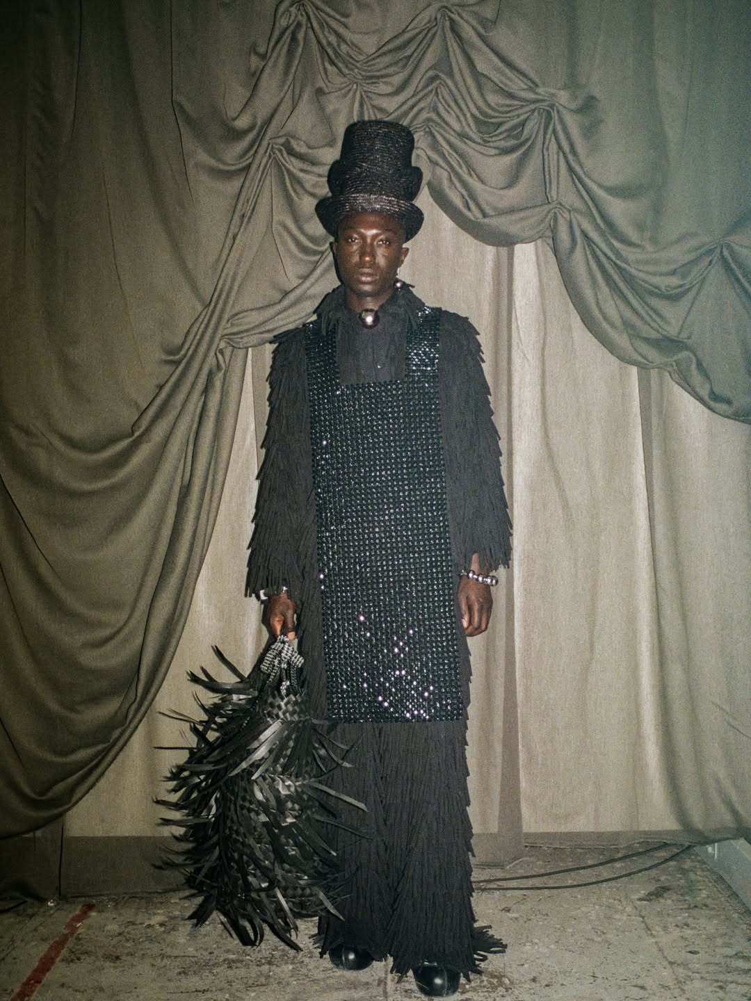 Her Spring Summer 2026 collection, titled Dual Mandate, continues her practice of using African traditions, techniques, and materials - Nigerian raffia and jute, cotton from Uganda and Kenya, and sisal from Tanzania - to produce various textiles and incorporates the body as an additional dimension to unify form and function and tell stories of the past and future. Techniques on display include hand-weaving, chainmail, crochet and glass blowing.