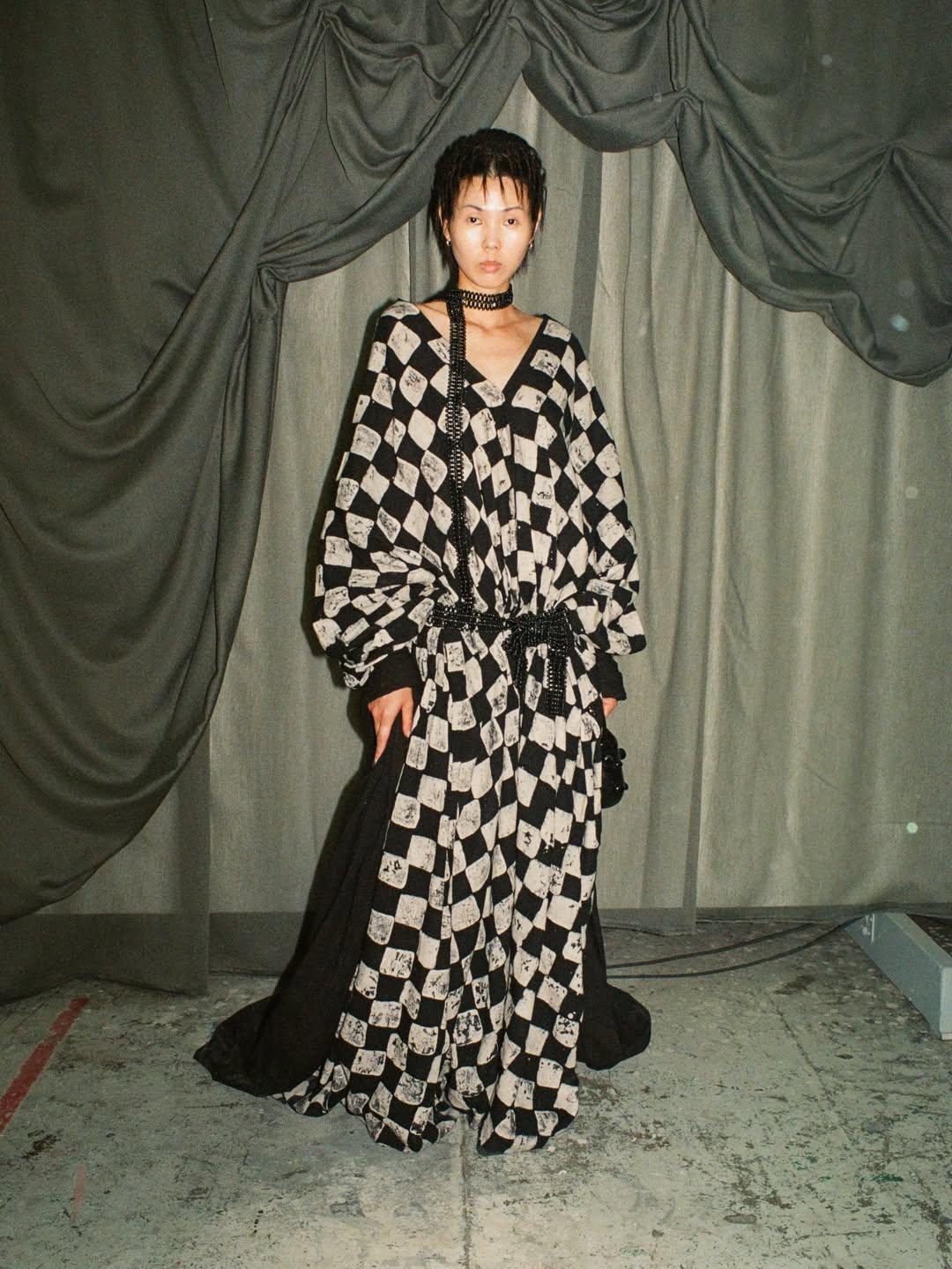 We especially enjoy the use of a chequered print made from honey wax and dyed with henna, the layering of textures using chainmail and beaded bibs, and recycled glass accessories.