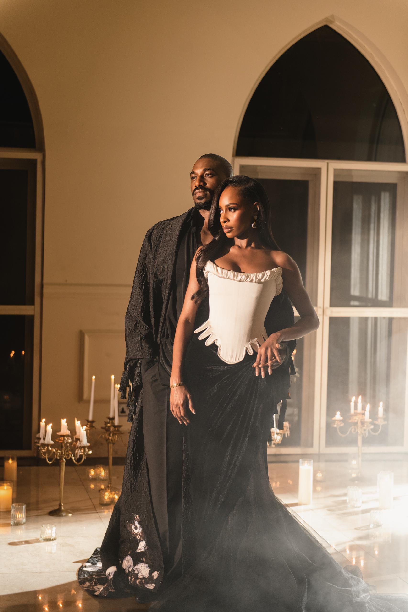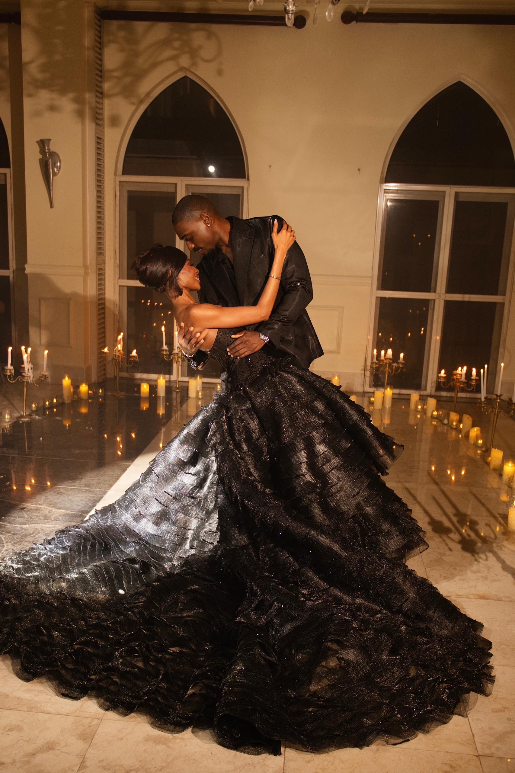 As the story unfolds, the garments act as the primary vehicle for this emotional translation: the first look, a period-inspired sculpted corset paired with a draped skirt, offers a masterclass in tension. It provides an architectural frame that feels both sultry and secure. It is designed for the woman who wishes to be held by her clothing as much as her partner, allowing her to lean into the moment with absolute grace. Shifting the energy, the second look: a high-low tube dress, redefines strength through simplicity. It moves in perfect sync with the wearer’s stride, lengthening the silhouette while maintaining a disarming softness that mirrors the vulnerability of a shared dance.